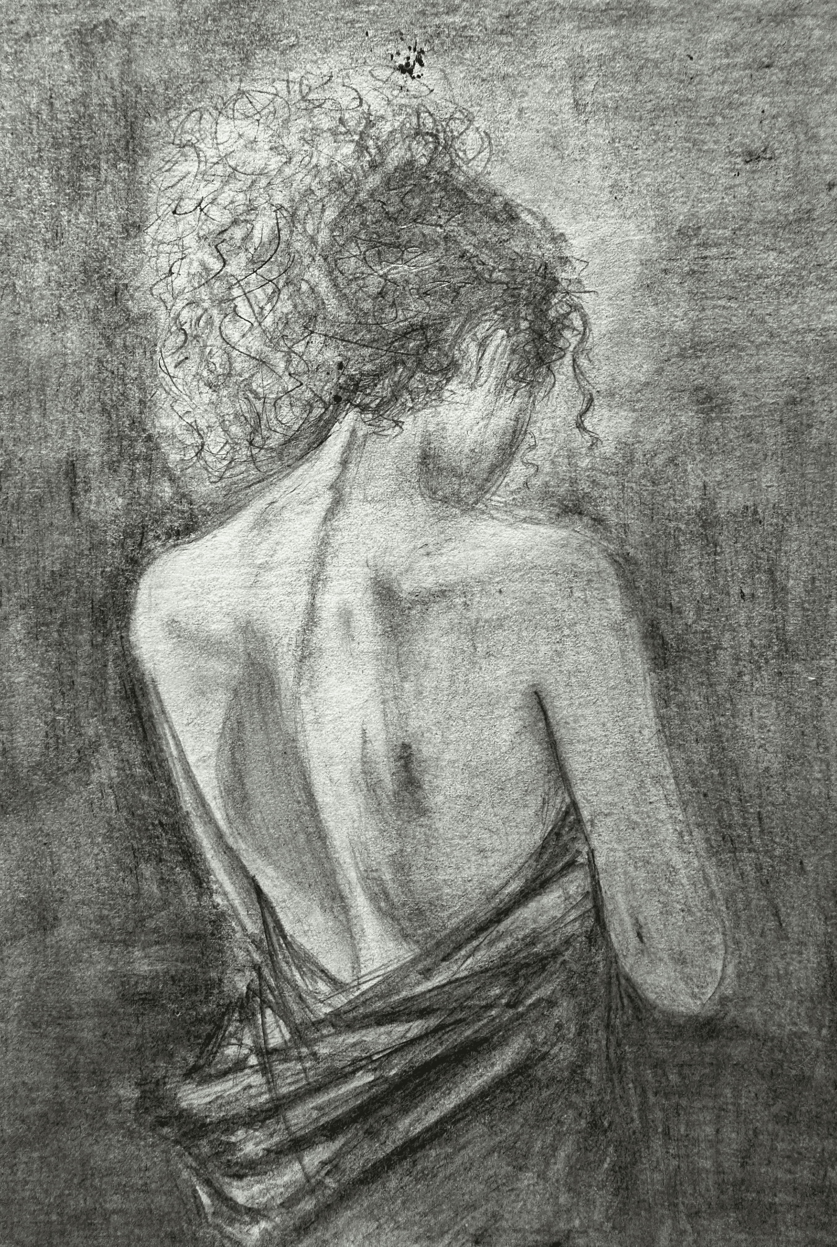 This drawing explores vulnerability through absence rather than exposure. The figure is turned away, partially concealed by a draped sheet, allowing shadow to become as active as the body itself. Rather than presenting the subject directly, the composition relies on suggestion—using light, fabric, and negative space to invite a slower, more attentive form of looking.